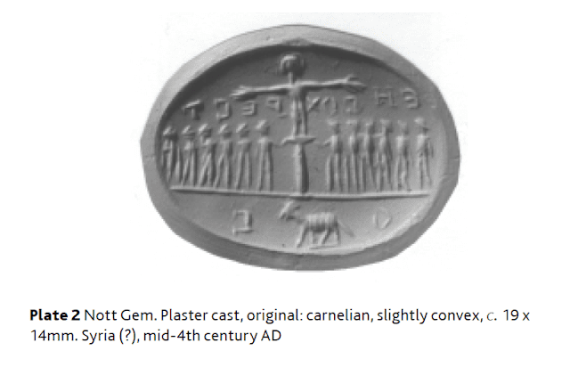 The evidence yielded from the study of engraved gemstones, which furnish even earlier representations of the subject, suggests that experimentation with pictorial representations of Jesus affixed to the cross had begun by the3rd century ad. While the experimentation might not have been extensive, or the results popular (given the paucity of evidence), the fact of it is very clearly if unexpectedly attested by the magical Pereire gem in the first instance, and the Constanza and Nott gems in the second.”