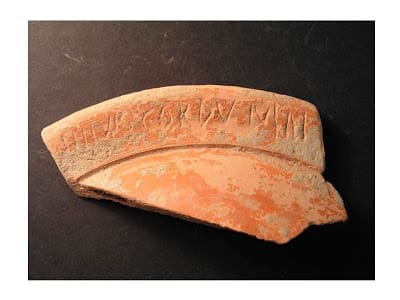 | Fig. 1. Grafito de Iruña-Veleia IR 16365. “VIILIII NO/ VVA BANA/ OSOV POLI/ TA. NIIV/ RII ATA/ ARAINA/ ARRAPA”.