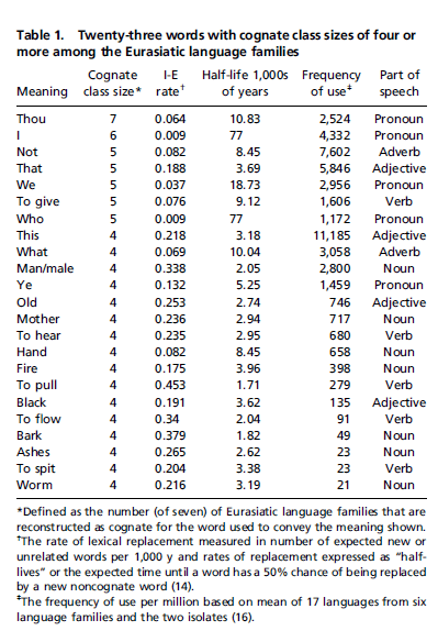 En base a la teoría desarrollada por dichos profesores, y siguiendo la forma de evolucionar de la biología, se pueden encontrar palabras que han permanecido hasta 15.000 años sin evolucionar y que nos permite reconstruir cómo a partir de una sola lengua creada en el mediterráneo se hayan desarrollado las actuales lenguas euroasiáticas, euskera y chino incluido.