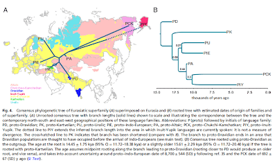 | Árbol filogenético de la siete familias de lenguas euroasiáticas según Pagel et al. 2013 |