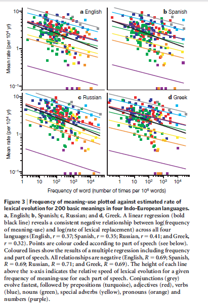 | Velocidad de cambio en función de la la frequencia de palabra según el tipo de palabra para varias lenguas (Pagel et al. 2007). |