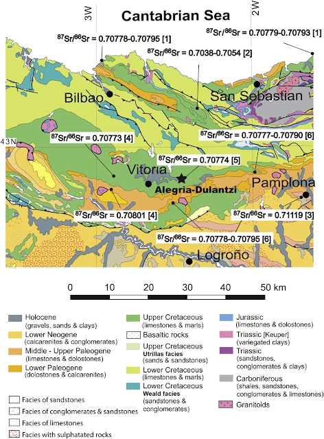| Proporciones 87Sr/86Sr para rocas de diferentes edades en el País Vasco (Fuente: Ortega et al. 2013) |