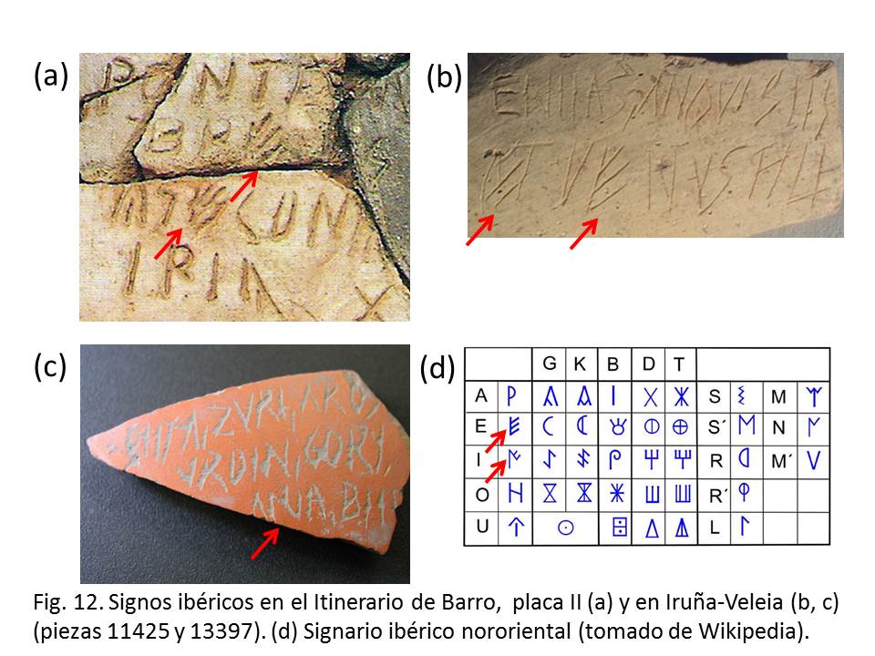 Aunque no tiene relación con la simbología cristiana, viene al caso señalar en este punto que existe otro hallazgo posterior a los de Veleia que presenta un paralelo con los mismos, que es el de las Es ibéricas contenidas en el texto latino de una de las cuatro placas del Itinerario de Barro (Fig. 12a), también comentado en este blog (9). Aunque las placas se conocían desde 1920, existía una fuerte polémica entre los expertos sobre su autenticidad, opinando algunos de ellos que eran falsas y estimando un autor que las consideraba auténticas (Antonio García Bellido) que eran del siglo I d.C. basándose en el contenido del texto (10). Solo fue en 2012 cuando se publicó el estudio en el que mediante termoluminiscencia se demostró definitivamente su autenticidad, datándose en el siglo III d.C. (10). Las Es ibéricas del Itinerario de Barro son muy parecidas a las que aparecen en el grafito de Veleia con el texto “ENEAS ANQUISES ET VENUS FILI” (Fig. 12b) (11). Otro signo ibérico, en este caso correspondiente a la I latina, aparece en otro grafito en lengua vasca de Iruña-Veleia (11) (Fig. 12c) (el carácter ibérico de todos estos signos me ha sido confirmado por Luis Silgo, historiador especializado en lengua íbera). Es muy sorprendente que aparezcan signos ibéricos en inscripciones del siglo III d.C., ya que las últimas inscripciones documentadas en escritura ibérica datan del siglo I d.C. (aunque en un congreso reciente se presentó una cerámica con una inscripción ibérica del s. II d.C., según me informa Luis Silgo). ¿Cómo sabían los supuestos falsificadores de Veleia que posteriormente a su falsificación se iba a publicar un artículo en el que se demostraba que en el siglo III d.C. se utilizaban signos ibéricos en inscripciones escritas en latín y que se iba a dar a conocer el hallazgo de una inscripción del s. IV d.C. que contenía “comillas triples”? ¿Cómo es posible que una falsificación reciente se adelante en el tiempo a hallazgos paralelos genuinos de época antigua?