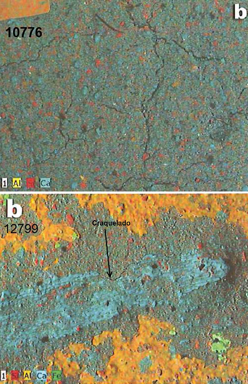 Aunque de la pieza se puede demostrar su autenticidad, es llamativo la poca presencia de zonas carbonáticas dentro de surcos, limitados al reverso. Surcos y roturas/desconchamientos muestran una fluorescencia parecida en intensidad. El engobe muestra menos intensidad de fluorescencia. Podemos observar, aunque no con demasiada claridad, la presencia de relleno en determinadas partes del surco.