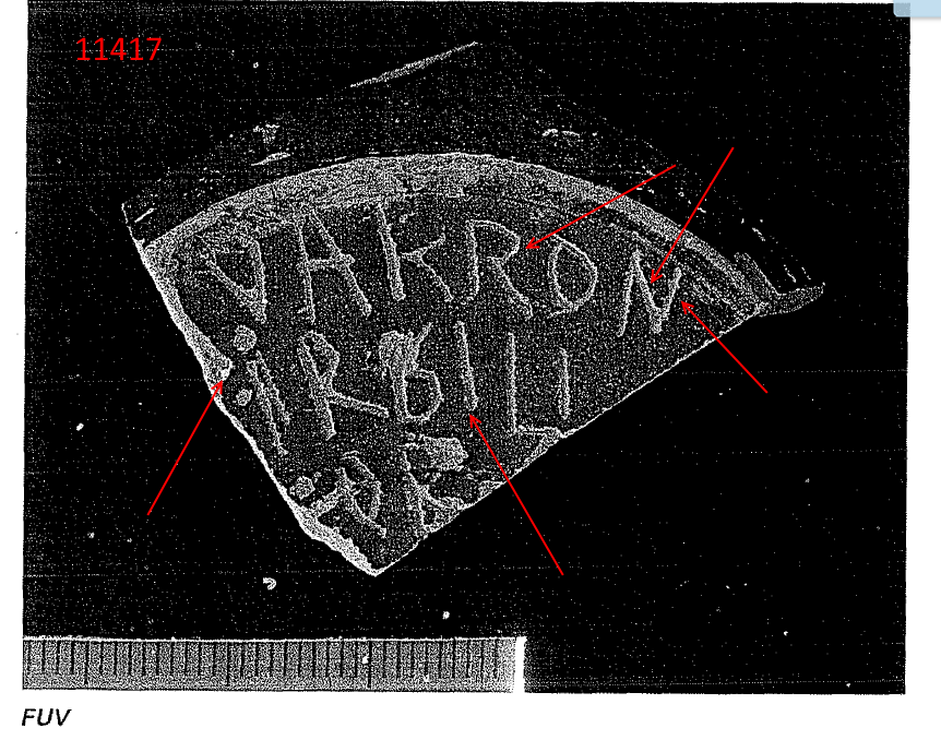 ■ Además de las partículas señaladas hay que citar la identificación de una [¡¡!!] escama microscópica de acero inoxidable (aleación de hierro-cromo Fe84,8-Cr 15.0-Ni0,2), inalterada y atrapada en las fisuras producidas en el engobe del surco de la primera ‘R’ de ‘VARRON’ (figura 11417.7) que nos indicaría el empleo en esta pieza de 2 útiles diferentes; junto a la misma aparece una pequeña partícula filiforme de oro (posible artefacto contaminado con compuestos orgánicos -carbono, nitrógeno- ajeno a la pieza).