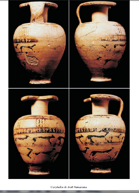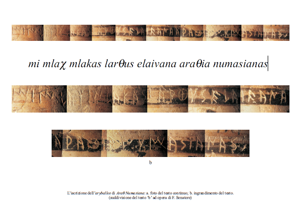 Important new evidence in favor of the genuineness of the text came from a new Etruscan inscription of the Orientalizing age published by Massimo Poetto and Giulio Facchetti in 1999. Infact the long inscription scratched on the body of an Etrusco-Corinthian aryballos shows agentilicium, Numasiana , which provides confirmation of the genuineness of the name Numasioi on the Fibula Prenestina, often regarded as suspicious by the supporters of the theory that it was a forgery. Though this piece of evidence seemed to many decisive, some doubts still remained of its relevance and somebody could even paradoxically imagine that the text of the Fibula could have been a copy of a genuine inscription, which had since been lost (and actually in the past somebody did suggest this!).