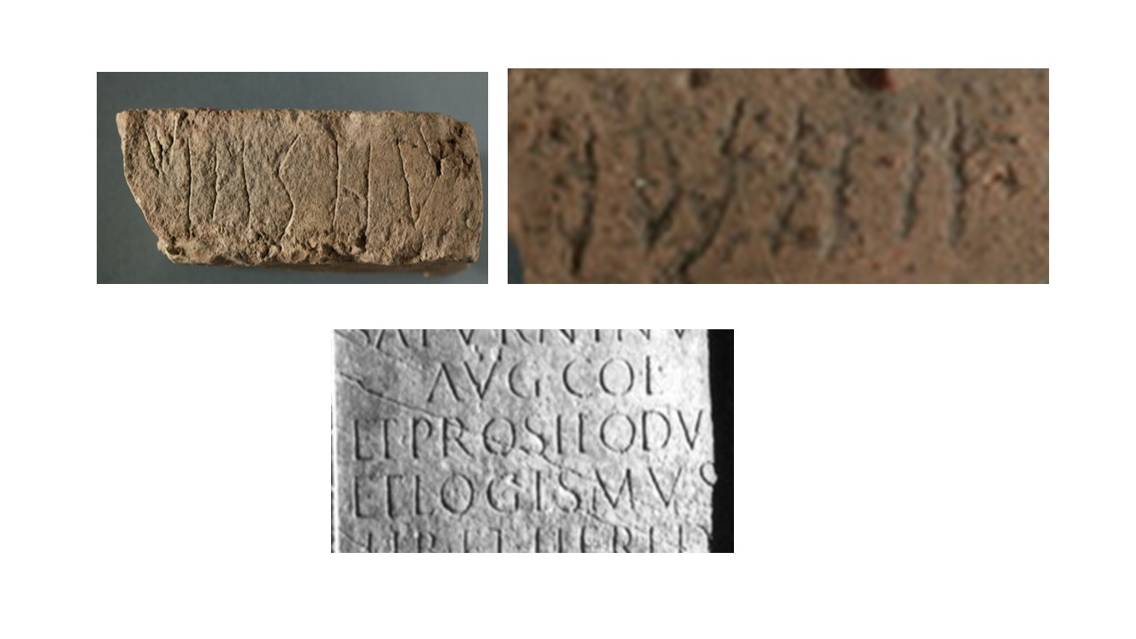 Fig. 10. Arriba: Pieza 13364 de Iruña-Veleia, con grafito que contiene una Ƶ atravesada por trazo horizontal en el medio. Abajo: Ƶs similares en inscripciones latinas antiguas.