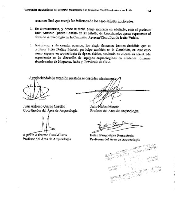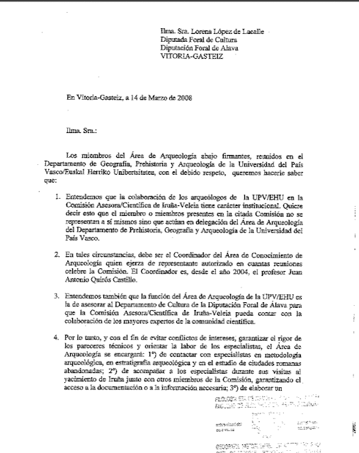 IMPORTANTE PUNTUALIZACIÓNEstoy autorizada para aclarar públicamente, por parte del coordinador del Área de Arqueología del Departamento de Geografía, Prehistoria y Arqueología de la UPV-EHU, Prof. Juan Antonio Quirós Castillo, que el «Plan Director para el yacimiento de Iruña durante los próximos 10 años», que se ha dado hoy mismo a conocer en rueda de prensa, es una iniciativa individual del Prof. Julio Nuñez, y que los restantes miembros de dicha Área han conocido los detalles de este convenio a través de los medios de comunicación.Existe en el informe del Área de Arqueología una bizantina carta de marzo 2008 que explica porqué el departamento ha decidido sustituir en la Comisión a Azkarate por Quirós: porque este último es entonces coordinador del Departamento.