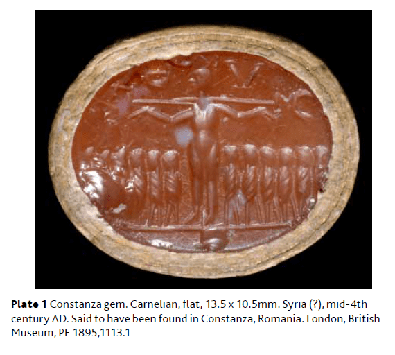 (F. Harley. The Constanza Carnelian and the Development of Crucifixion Iconography in Late Antiquity. C. Entwistle and N. Adams, Gems of Heaven: Recent Research on Engraved Gemstones in Late Antiquity (British Museum Press, 2011), pp. 214-220.