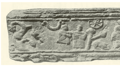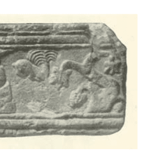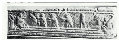 | Fig. 6. Sarcófago de Poza de la Sal. muy desgastado. Vid en las partes laterales y un crismón en la parte izquierda hacia el centro¿? Fuente: https://www.uam.es/personal_pdi/filoyletras/afuen/trabajos/trabajos_generales/Samper%20Carro,%20Sofia%20-%20sarcofagos_paleo_loc.pdf |
