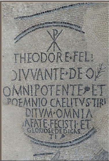 | Inscripción dedicado al papa-fundador de la iglesia con hojas de hiedra y una palma. Fuente: http://romeartlover.tripod.com/Aquileia4.html |