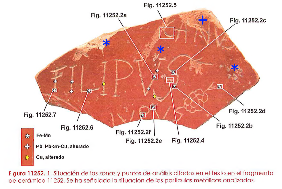 • El material presente en el fondo de los surcos sin relleno presenta una textura fina y una composición coincidente con la de los análisis realizados en el sustrato cerámico en zonas de pérdidas de engobe, por lo que se han interpretado como restos del material erosionado en el trazado de los grafitos.En el material de relleno de las letras también se han identificado diversas partículas metálicas alteradas de plomo (figura 11252.6), plomo con pequeñas proporciones de estaño y cobre en una de ellas y cobre en otra (figura 11252.7). » (4)