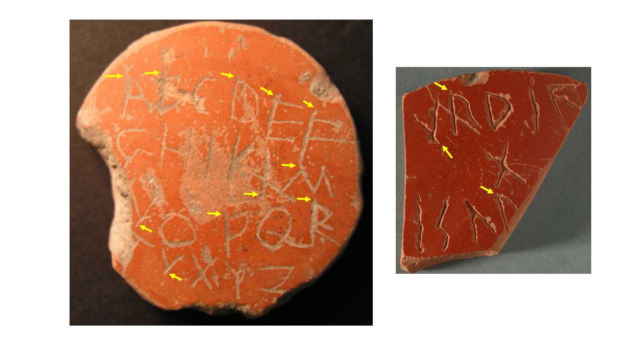 Fig. 3. Pieza 15542 de Iruña-Veleia (izda.) con trazos que sobresalen de las letras por arriba y por debajo, al igual que en el grafito de la pieza 15147 (dcha.).