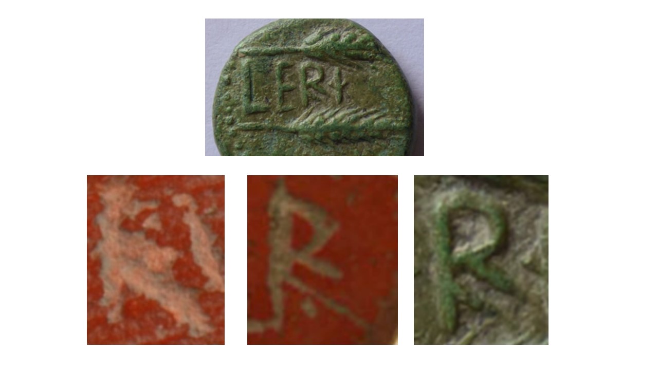 3) Si la lectura de la inscripción de la cruz fuera RIP, que he argumentado como más probable, tendría un paralelo parcial en el Rex Iudaeorumdel evangelio de San Marcos y en el Rex Iud de la crucifixión de un relicario del siglo V, apartándose del INRI (Iesus Nazarenus Rex Iudaeorum) del evangelio de San Juan establecido en las crucifixiones desde época medieval. La forma de la R, con doble trazo oblicuo, también tendría un paralelo paleográfico en el grafito del abecedario de Iruña-Veleia, de cuya exhumación hay testigos, y en la R de CERI de una moneda de época romana encontrada cerca de Jerez. Sería muy difícil concebir que un falsificador moderno conociera este tipo de R debido a su rareza: no aparece en los grafitos de Pompeya [26], Ostia Antica [27], Segóbriga [28] o Augusta Raurica [29], ni en las cartas de Vindolanda [30], ni en el libro de epigrafía latina de John E. Sandys [31].