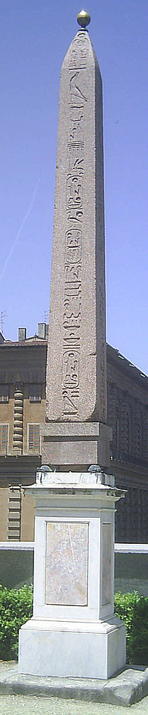 Las inscripciones son dedicadas a Atum, el dios de la ciudad de Heliopolis. Se supone que ha sido levantado durante el reinado de Ramesses II. Fue transportado a Roma en el primer S. AD, por el emperador Domotianus y colocado dentro del templo de Isis – Iseum Campensis (en el Campus Martius, junto a tres otros obeliscos que todavía se encuentran en Roma: Monunumento a los caidos en Dogali, el obelsico de la Piazza del Pantheon (Macuteo), y el obelisco en frente Santa Minerva. Se encuentra ahora en Florencia, en los Parques Boboli.