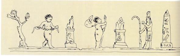 On a Phoenician silver vessel from the 6th century B.C. we recognize a lot of „Egyptian themes“, e.g. the pharao smites the enemy in front of a god, the young god Horus on a lotus-flower and four cartouches (6, fig. E). Inside the cartouches there are written hieroglyphs without sense. The Ancient Egyptian scenes can be found on temples all over Egypt and the cartouches symbolize the King, the Pharao – even the name cannot be read. And in this case a lot of Ancient Egyptian „relics“ were used later, mainly as decoration or symbols.