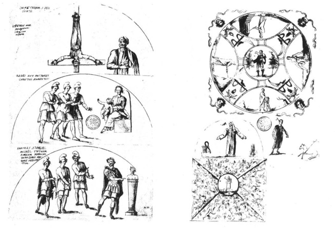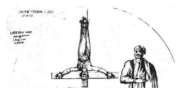 => 1. Observación: Crucifixión invertida. Izquierda de la lámina: cruz invertida con figura clavada de la catacumba de San Calixto. Repito: la figura está sujeta con clavos a una cruz en T latina explicitamente plana (en «tabla» y no madero rollo)