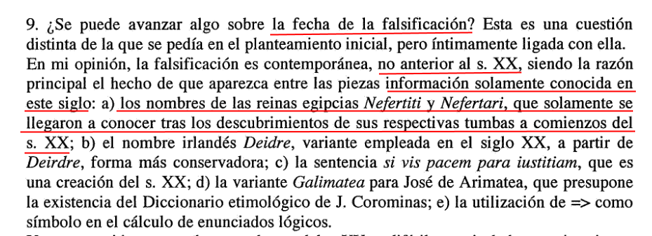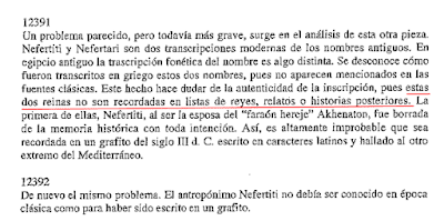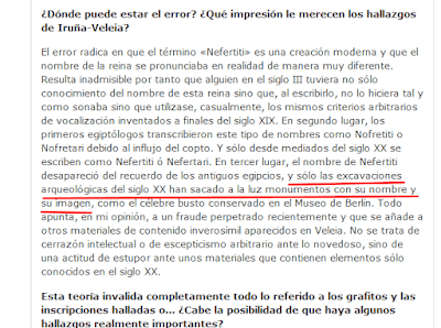 PD Sobre información errónea relacionado con Nefertiti en los pronunciamientos de los profesores Gorrochategui, Moreno y Galán. Prof. Gorrochategui afirma que el redescubrimiento de la persona de Nefertiti (y Nefertari) es algo del siglo veinte, y lo utiliza para datar la falsificación en el siglo veinte. Profesor Moreno afirma lo mismo, pero sobre su nombre afirma que solo fue utilizado a partir del de la mitad del siglo XX la forma ‘Nefertiti’ (y Nefertari) y que anteriormente [de 1950 digamos] fue conocido bajo la versión copto de su nombre ‘Nofretiti (y Nofretari). Los 3 afirmaron que dicha reina fue borrado de la historia: