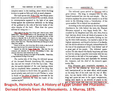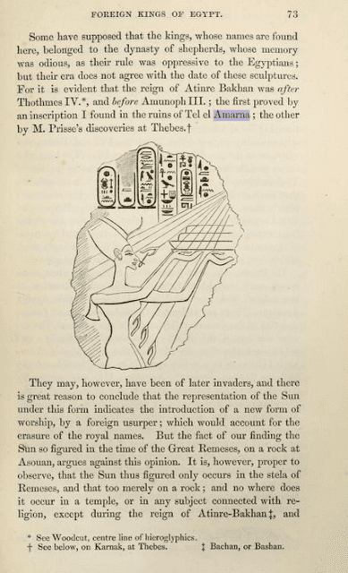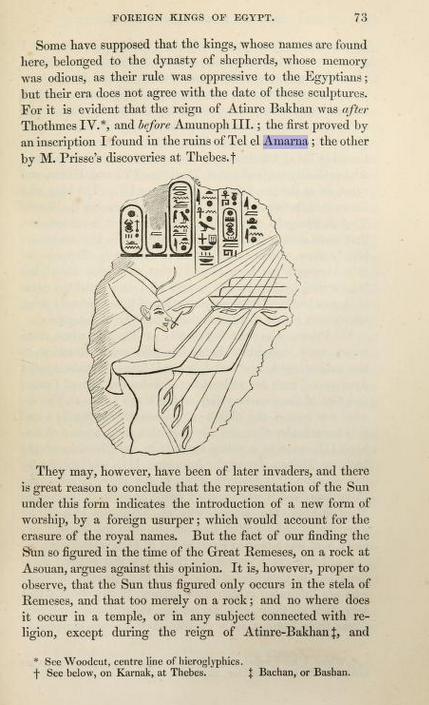 | El autor hace referencia a la estela de Gebel Tuna, donde aparece la familia real con Akenaton (llamado aquí Atin-re-Bakhan, Atin-re es Aten/Aton) sin pronunciar el nombre de Nefertiti John Gardner Wilkinson (1843). Modern Egypt and Thebes : being a description of Egypt, including information required for travellers in that country. |