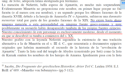 Ya hemos visto que es muy probable que la persona de Nefertiti fuera citada bajo el nombre de Acherres en Manetón, y que entonces la llamada Damnatio Memoriae por parte de la Dinastia XIX no fue suficiente efectivo para para la transmisión de la historia de Amarna. Ver tambien ¿Sufrió NEFERTITI una efectiva damnatio memoriae? y Viaje a Hermopolis.
