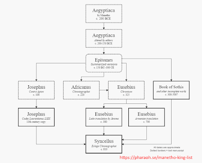 Las diferentes fuentes sobre el trabajo de Manetón se pueden consultar en https://pharaoh.se/historians, una buena página de referencia con alguna información contradictoria, pero que parece bien sincronizado con las nuevos teorías.