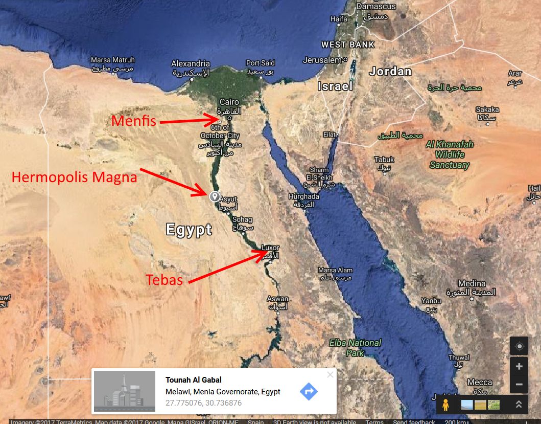 Herodoto cita en su ‘Historia’ el necropolis de ibis (ibiotaphon) – catacumbas que se encuentran a 1 km de la estela A con Neferetete y Akenaton y sus cartuchos, y a 5 kms del antiguo Hermopolis, ciudad de Hermes: