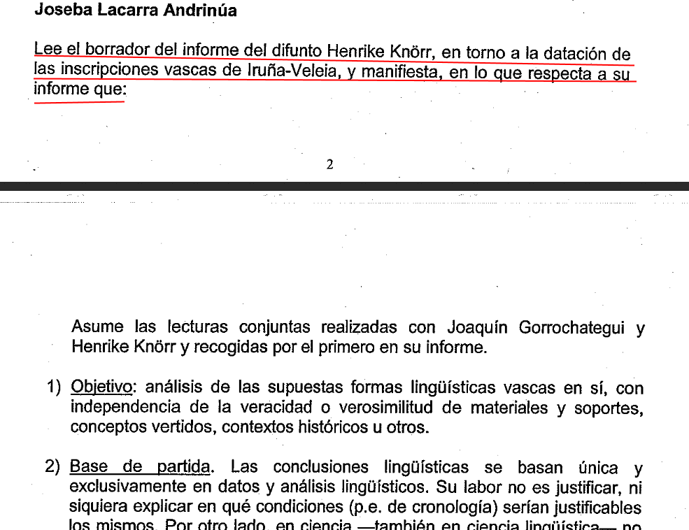 Del difunto prof. Knörr no consta ningún informe, únicamente algún e-mail donde afirma dudas sobre la datación, sin que afirma nada definitivo. Este escrito ha sido abusado por la Diputada y prof. Lacarra en la sesión de Juntas Generales. Su contenido aparece tampoco en la Acta de la reunión de la Comisión del 26/6/2008 lo que me parece un grave intento de esconder información: