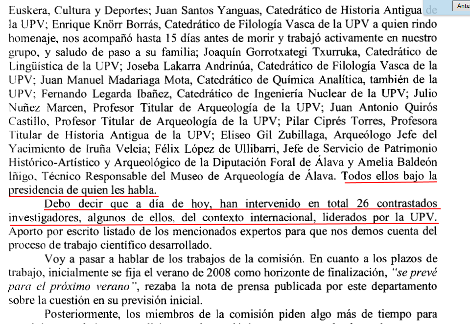En la prensa se repita siempre que ‘han intervenido‘ 26 expertos en la Comisión Científica Asesora de Veleia. Si las contamos en la lista de la Diputada de Cultura son 28 (o 29 si no olvidamos al profesor italiano Carletti; ver Nota de la Diputada de Euskera, Cultura y Deportes, Lorena López de Lacalle Arizti), si somos un poco crítico son 18, y si somos serios y contamos los nombres de autores y coautores en los informes son 16 (o 17 con Eliseo incluido). Esta situación caótica parece sintomático para todo el funcionamiento de la Comisión. También es sorprendente que la Diputada de Cultura misma, Lorena López de Lacalle, no aparece en la lista como miembro de la Comisión, aunque sí afirma que ella es la Presidenta. Además llama la atención que la Diputada de Cultura utiliza una palabra muy poco precisa: