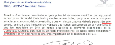 Piden poder continuar investigando las piezas de manera multidisciplinar «avanzando en un escenario de una gran importancia en el desarrollo del País.» Evidentemente suscribimos está petición, pero me parece un reconocimiento inconsciente que hasta aquel momento no han avanzado y que quieren llegar a resultados. La «gran importancia para el desarrollo de País» es un absoluto misterio, sobre todo visto lo indeciso y deficiente que es el informe, además SIN TERMINAR LA ANALÍTICA: