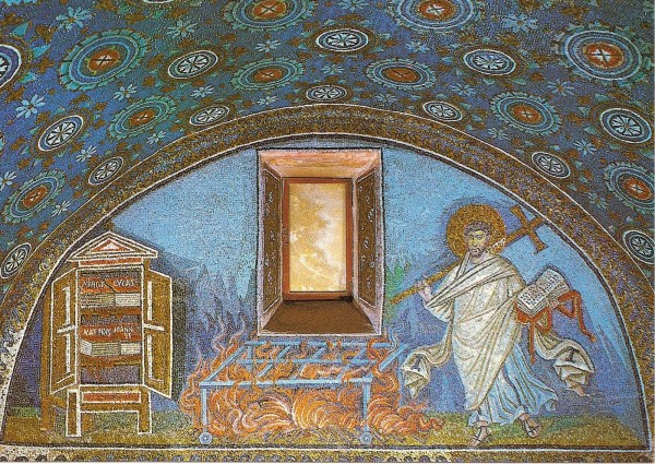 Vemos uno muy similar en el Mausoleo de Gala Placidia en Rávena, construido entre el 425 y 430 d. C (es decir, coetáneo con la escena del grafito 13344 de Iruña Veleia).