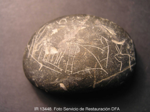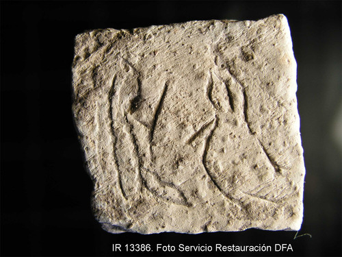 Ficha arqueológica, Ostracabase: Figura humana en posición orante, sobre cuya cabeza hay tres pequeños trazos convergentes. A su izquierda una figura que podría ser un crismón o un esquematismo.