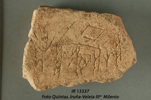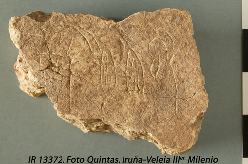 Grafito 13344: Sector 6, Recinto 12/14, UE. 6185: Encontrado entre el mismo material de relleno, como el anterior, y de cronología coetánea, es decir, cronología siglo V d.C. (Ostracabase)