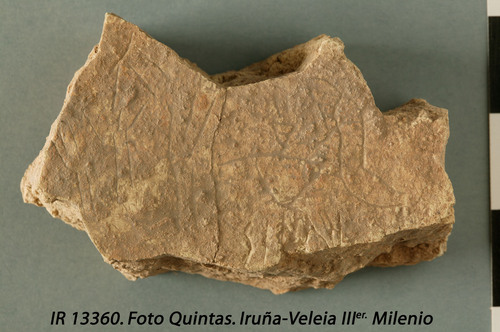 Ficha arqueologica, Ostracabase: Crucifixión con una figura humana en la cruz. Representada con barba y rasgos esquemáticos. Un trazo oblicuo lateral que sale de la zona central de la figura, podría representar una lanza clavada. Sobre la figura y en la parte superior de la cruz, el epígrafe INRI