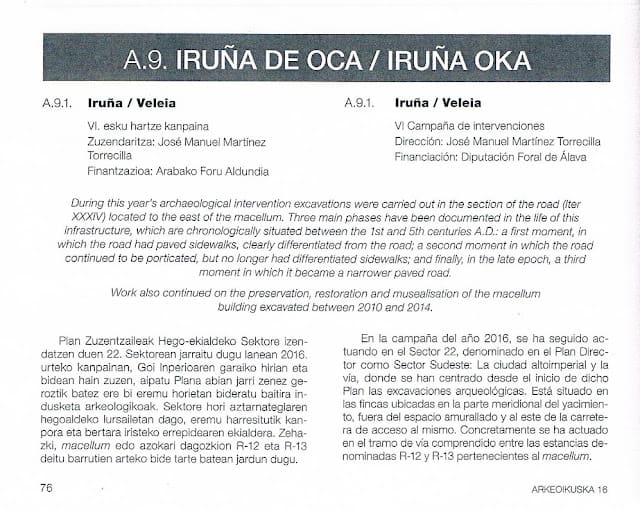 También por Iruña-Veleia: en el Arkeoikuska del 2010, hablando de los trabajos recién inciados del Plan Director 2010-2020, Julio Nuñez Marcén asegura: «De este modo, se pudo documentar ya tras esta primera limpieza, (trabajos ejecutados por una retroexcavadora) el trazado del Iter 34 del Itinerario de Antonino, situada en la parte oriental sureste-noroeste…» (del «Macellum)….que ya pudo ser documentada en la segunda fase constructiva de la misma calzada a su paso por cercano yacimiento de Mariturri (Nuñez, Saenz de Urturi, 2005) (En ese orden)