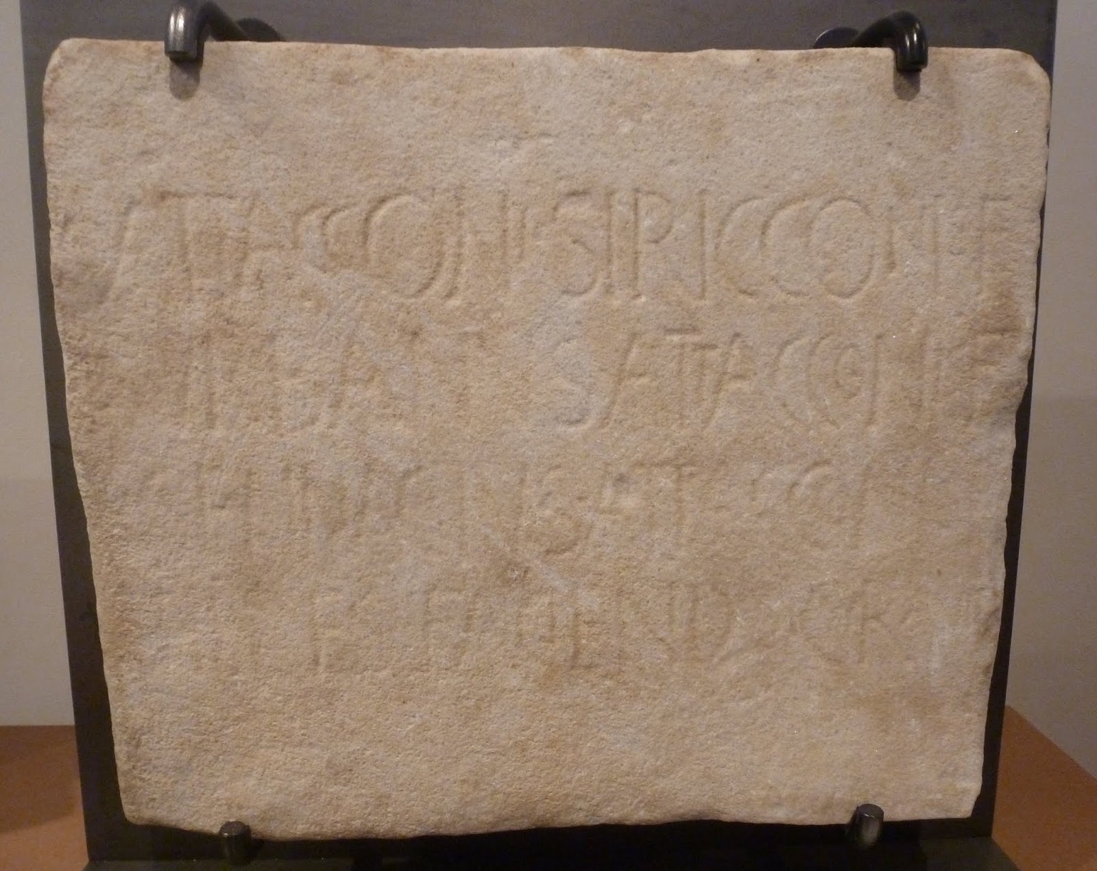 Le graveur «veleyense» a peut-être écrit ATA, «père», forme ne faisant apparaître qu’un seul -t-, afin d’éviter que ne se produise une confusion avec l’anthroponyme, attesté durant l’Antiquité, ATTA (Albertos Firmat, 1966: 42; Navarro Caballero & Ramírez Sádaba, 2003: 104), cet anthroponyme étant également le surnom que portait un poète dramatique latin: C. Quinctius Atta.