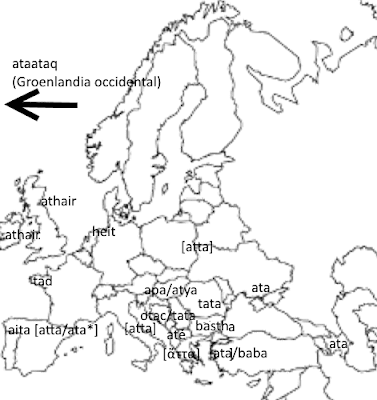 | La palabra ‘padre’ como nombre formal en diferentes idiomas: distribución de formas que parecen relacionados con la raíz *at como en el proto-indoeuropeo [] son formas antiguas obtenidas en las referencias citadas las formas actuales son en la mayoría de los casos de la página https://forum.wordreference.com/threads/mother-father.113508/ aportados por supuestamente ‘nativos’ ata* es la forma que encontramos en Iruña veleia ata es la forma antigua en turco, hoy en día se utiliza baba heit en frisón y bastha en búlgaro me llamaron la atención *** La primera línea del Padre Nuestro: azerbaiyano: Ey göylərdə olan Atamız bretón: Hon Tad hag a zo en neñv euskera: Gure Aita, Zeruetan zaudena frisón: Us Heit yn ‘e himmel irlandés: Ár nAthair, atá ar neamh escocés: Ar n-Athair a tha air nèamh hungaro: Mi Atyánk, ki vagy a mennyekben groenlandés occidental: Ataatarput qilanniittutit romaní (‘gitano’): AMARO DAD SAVO SAN/HAN ANDE LE NABAHHA *** ἦλθες, Τηλέμαχε, γλυκερὸν φάος . οὔ σ᾽ ἔτ᾽ ἐγώ γε <br />