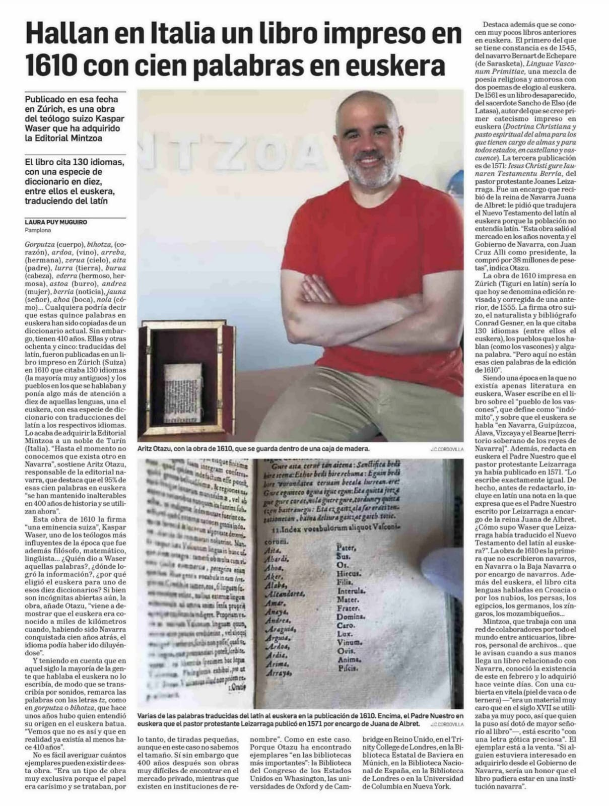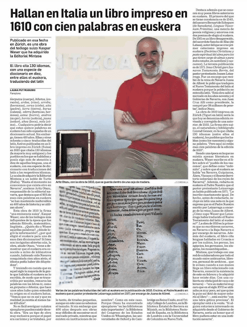 En diferentes medios de comunicación se recogen noticias sobre la compra por parte del editorial Mintzoa de un ejemplar del libro «Mithridates de differentiis linguarum» (1610) del humanista Conrad Gessner (1516-1565) que incluye unas cien palabras en euskera con su traducción al latín, y es así una nueva fuente única del euskera del siglo XVI, entre el diccionario de Nicola Landuchio, el manuscrito de Lazarraga, Bernart de Echepare y algunos documentos más. En la prensa se habla de