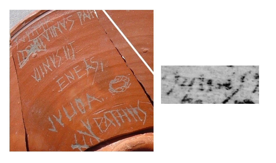 Aparte de estos paralelos del cáliz, como se mencionó arriba, en Vindolanda también hay paralelos paleográficos con Iruña-Veleia en las cartas escritas en tablillas (4,5). Entre ellos, la presencia de “Js”. Por ejemplo, en el nombre JVLIVS que se muestra arriba (Fig. 8) vemos que la primera I tiene una forma elongada y curvada, con cierta semejanza a una J moderna, pero la segunda I tiene la forma habitual de las Is latinas. Algo parecido observamos en el JVPITIIR y JVLIO de la pieza 11139 de Iruña-Veleia, donde las Is iniciales tienen cierta semejanza a Js, pero las que van en medio son Is “normales”.