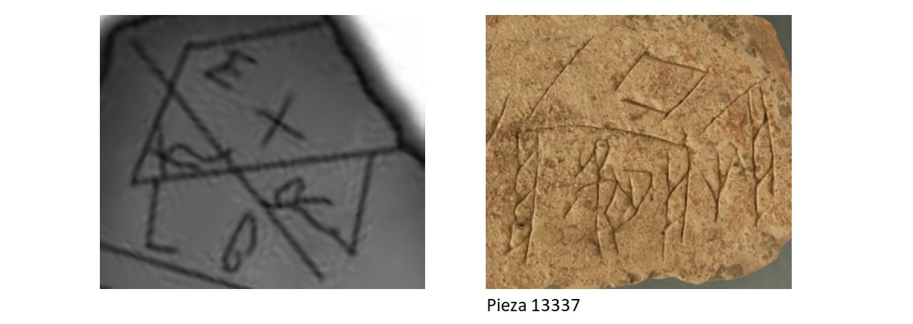 – En el cáliz de Vindolanda se ven tres barcos, dos de ellos con mástiles y velas y el tercero con lo que podrían ser dos mástiles con banderas. En cuatro piezas de Iruña-Veleia también se representan barcos, dos de ellos con mástiles y uno con vela (Fig. 6). El significado religioso del barco de la pieza 13336 es evidente, pues aparece junto al nombre ‘’’IVAN[ ] que está acompañado por una “marca triple” de santidad a su izquierda y posiblemente otra a su derecha, aunque ésta no se vería debido a la fractura de la pieza. En un contexto cristiano, el barco simboliza la Iglesia, como se explica en (15,16). El símbolo de la nave también se utilizó en contextos funerarios paganos grecorromanos para representar la barca de Caronte, el barquero de Hades, que transportaba las almas de los difuntos de un lado a otro del río Aqueronte (9).