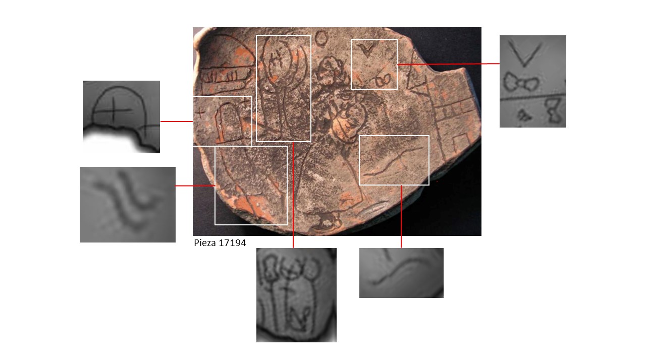 Los paralelos para mí más llamativos e intrigantes son con el grafito coloquialmente conocido como de “la pasiega” (pieza 17194 de la Ostracabase) (7). Arriba se muestra el grafito, en el que los motivos similares a símbolos grabados en el cáliz de Vindolanda se resaltan encuadrándolos, uniéndolos con una línea a símbolos parecidos del cáliz (Fig. 2). Los parecidos son múltiples: