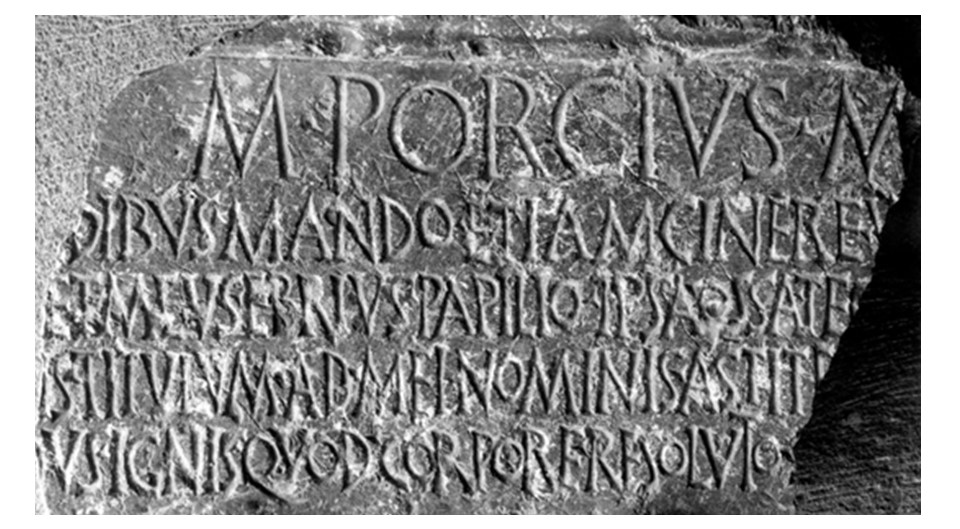 Traducción: “Marcus Porcius hijo de Marcus [ ] mando también a mis herederos que rocíen con vino mis cenizas, para que sobre él revolotee mi mariposa ebria. Que las hierbas cubran mis huesos. Si alguien se detiene ante el epitafio de mi nombre, diga: aquello que dejó el voraz fuego que, una vez disuelto el cuerpo, lo convirtió en pavesas, descanse bien.”