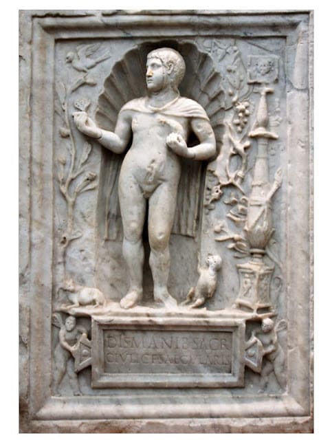 Es difícil creer que tantas coincidencias sean fruto de la casualidad. Lo más destacable es el parecido de la “V” (¿ave volando?) sobre lo que parecen ser mariposas. En la antigüedad grecorromana, tanto la mariposa como el ave eran símbolos del alma (8-11), apareciendo con este significado en la iconografía y en inscripciones sepulcrales. Un ejemplo es el cippus de Julius Saecularis (12) (Fig. 3), en el que se ve la imagen del joven difunto agarrando con la mano derecha una mariposa, por encima de la cual hay un pájaro; también se representa a la derecha un árbol. Por lo tanto, hay tres elementos (mariposa, ave y árbol) que coinciden con elementos de la pieza 17194 de Iruña-Veleia.