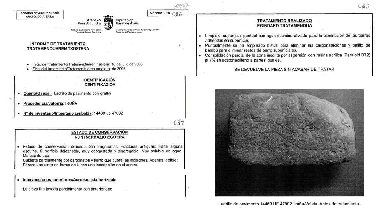 “Dado que el ladrillo se encontró un viernes, fue al lunes siguiente, el día 17, cuando se sacó de la bolsa, se le dio número de inventario y se empezó a lavar su superficie oculta bajo adherencias superficiales. Como algunos grafitos del yacimiento ya se habían convertido en polémicos en la red, y por otra parte algunos sondeos los seguían proporcionando, al constatar grabados, no se siguió con la labor de limpieza y la pieza se puso ese mismo día en manos de la DFA, como demuestra el hecho de que ya al día siguiente, el martes 18 de julio, comienza a tratarla el Servicio de Restauración. Las concreciones se componían de carbonatos y barro, como señala el informe de Restauración, fuertemente adheridos, ya que las restauradoras tuvieron que utilizar “bisturí y palillo de bambú”, como especifican, observando más trazos incisos.”