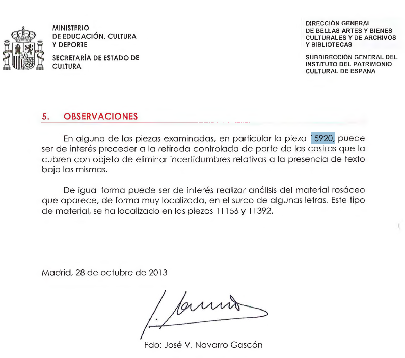 Last but not least afirma: «Dadas las incertidumbres que presenta la pieza, puede ser de interés proceder a la retirada controlada de las costras que aún persisten para verificar de forma inequívoca la presencia o ausencia de texto bajo las mismas.»