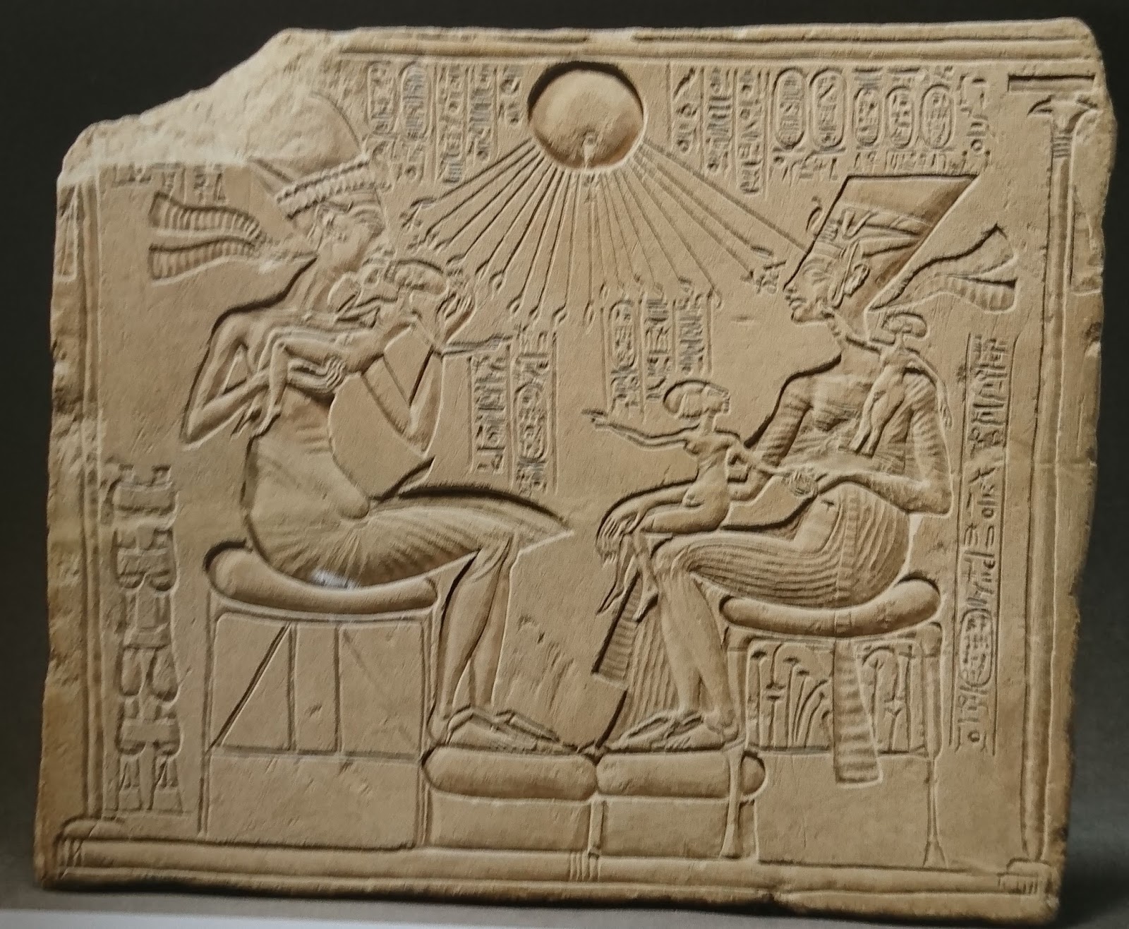 Escena familiar muy inusual, casi de la prensa rosa moderna con el faraón Akenatón besando a su hija Meretaten, y las otras 2 hijas de una manera muy informal sobre el cuerpo de la reina Nefertiti, todo bajo la protección de las rayas de Aton. Es notable que en muchas ocasiones la pareja real es representada como iguales (Freed et al. 2000).