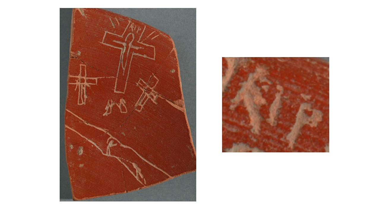 Eliseo Gil y su equipo de Lurmen, que gestionan el yacimiento de Iruña Veleia, desvelan el hallazgo de la representación de un calvario, escenas de la vida cotidiana y palabras en euskera y latín sobre fragmentos de cerámicas, piedras y huesos de los siglos III, IV, V.
