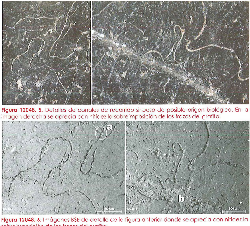 Marcas de plantas o de fungi (?) son por lógico indicadores que se forman durante un largo plazo de tiempo y que indican el enterramiento. Si encontramos estas marcas superimpuestas sobre surcos – con una clara relación estratigráfica de posterioridad, pueden ser perfectas pruebas de antigüedad de los grafitos sobre los cuales aparecen.