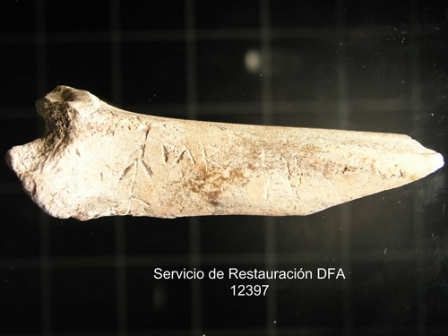 Finalmente, en un fragmento de epífisis proximal de cúbito izquierdo de jabalí se lee los nombres de los dioses egipcios Isis / Osiris / Anubis (nº 12395), relacionados los tres, cada uno a su manera, con el mundo funerario: Anubis, representado como un perro negro o bien como un humano con cabeza de perro o chacal, era el dios protector de las necrópolis responsable de la resurrección del alma por ser el dios maestro de embalsamaciones al haber participado junto a las hermanas gemelas Isis y Neftis en la momificación de Osiris, inaugurando, así, en la historia egipcia este rito que desde entonces se le atribuía, siendo, además, el dios que purificaba los cuerpos y los corazones contaminados por la bajeza terrestre para hacerlos incorruptibles y eternos, así como quien evaluaba las almas con el pesaje del corazón. Según Plutarco, Anubis era hijo de Neftis y el consorte de Isis, Osiris, con cuyo culto fue sincretizado.