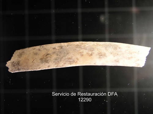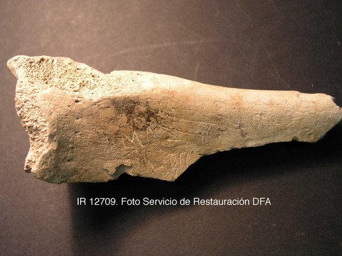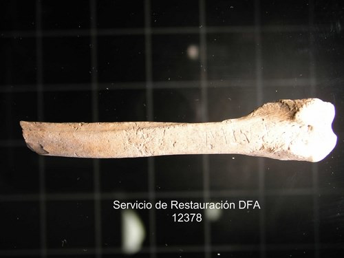 El soporte del grafito cristiano In nomine pat[ (nº 13362) es, empero, mortero cerámico, pero procede de un contexto estratigráfico distinto de todos los anteriores: el sector 6, apodado domus ecclesia por los arqueólogos de Lurmen, en el cual se halló buena parte de las piezas escritas en euskera y un gran número de grafitos iconográficos de temática cristiana realizados siempre sobre fragmentos cerámicos y ladrillo, lo cual justificaría la presencia de esta expresión cristiana en el óstracon cerámico en cuestión; no debe ser ignorado, por otra parte, que los hallazgos del sector 6 son cronológicamente posteriores a los del sector 5, hecho que, naturalmente, ha de ser tenido en cuenta en lo que atañe a la interpretación que habría de dársele al uso, a los fines y al simbolismo del hueso en el caso de los hallazgos del sector 5. También procede del sector 6 (concretamente de la UE 6185, datada por el método estratigráfico a partir del siglo V d. C.) el grafito indudablemente cristiano nº 13343 realizado sobre una falange de bóvido que representa una crucifixión: se trata de una escena figurativa desarrollada en tres de las caras del hueso, en cuya parte frontal aparece la persona crucificada, en un lateral una figura humana esquemática y en el otro una figura humana claramente femenina en posición orante. La crucifixión evocada ha de ser no otra que la de Jesús, siendo la figura femenina la Virgen María, si no María Magdalena. En cambio, procede del sector 5 el nº 12399, un fragmento óseo de macromamífero en el que se lee la palabra vasca aien (“vid”, “sarmiento”) junto a varios grabados diminutos indiscernibles entre los que sí parece apreciarse un círculoradiado (¿el sol?) y un humanoide minúsculo. También este grafito contendría una alusión cristiana, dado que la vid era uno de los símbolos que se asociaban a Jesús (12).
