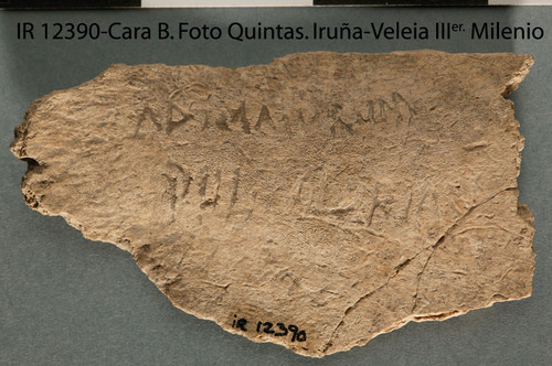 Gracias, además, a este óstracon es posible interpretar la figura femenina tachada con un aspa que representa a Deidre en el árbol genealógico esbozado en el óstracon cerámico nº 12099, que muestra al completo los integrantes de una familia presuntamente céltica (a juzgar por sus nombres) asentada en Iruña-Veleia en el siglo III: Deidre es la tercera hija del matrimonio formado por Dalia y Riamo, y, tal y como se desprende del grafito de la mandíbula catalogado con el nº 12430, presumiblemente escrito por Parm(enio) tras la muerte de Deidre y dedicado a ella, murió de manera prematura y no natural (pues, parafraseando a Heródoto –Hist., I, 87-, en la paz es lo natural que los hijos entierren a los padres, siendo sólo en la guerra cuando son los padres quienes entierran a los hijos). Esa muerte inesperada y -cabe suponer- trágica explicaría que, en el árbol genealógico, la figura que representa a Deidre esté tachada con un aspa; también que la figura que representa a la madre de Deidre, Dalia, aparezca dibujada en estado, y que junto a ella se escribiera Daliaet Deidre II, lo cual parece deber interpretarse como un deseo (seguramente el de la misma Dalia) de que Deidre resucitara en forma de un nuevo bebé en el vientre de su madre. El óstracon que contiene el árbol genealógico podría, pues, perfectamente responder a una práctica mágica mediante la cual se invocara a la divinidad para rogarle sus favores en la concepción de esa segunda Deidre: sabido es que el pueblo romano -las mujeres especialmente- era dado a este tipo de rituales domésticos conocidos genéricamente como goetia (o hechicería), distintos de la teurgia olamagia propiamente dicha y entendida como una técnica o arte (techné) con reconocimiento a nivel público y permitida (a diferencia de la goetia) que reportaba ciertos beneficios a la comunidad y que en ocasiones era incluso auspiciada por los correspondientes sacerdotes (1). Sin embargo, el soporte de dicho óstracon es cerámica, y no hueso, siendo ésta una excepción a señalar para el conjunto de grafitos que, por su contexto mágico ritual, fueron grabados sobre hueso.